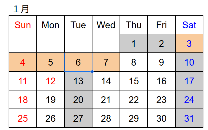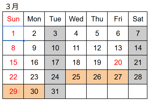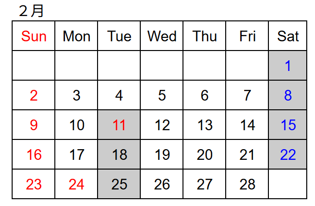 月の予定 (グレーは休業日)